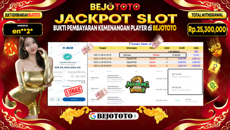 BEJOTOTO – Selamat kepada User id : en**2* Telah berhasil mendapatkan kemenangan besar pada permainan SLOT MAHJONG WAYS-2 Dengan kemenangan Sebesar Rp.25,300,000-. Setelah mengisi formulir withdraw dengan kurung waktu hanya 5 – 10 menit pihak BEJOTOTO sudah melakukan transfer kepada pemilik Userid dan dana sudah dapat di cairkan oleh pemenang. Bukti pembayaran yang kami berikan merupakan bukti pembayaran yang SAH /…