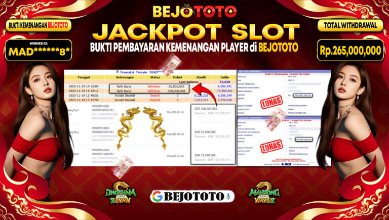 BEJOTOTO – Selamat kepada User id : MAD*******8* Telah berhasil mendapatkan kemenangan besar pada permainan SLOT MAHJONG WAYS-2 Dengan kemenangan Sebesar Rp.265,000,000-. Setelah mengisi formulir withdraw dengan kurung waktu hanya 5 – 10 menit pihak BEJOTOTO sudah melakukan transfer kepada pemilik Userid dan dana sudah dapat di cairkan oleh pemenang. Bukti pembayaran yang kami berikan merupakan bukti pembayaran yang SAH…