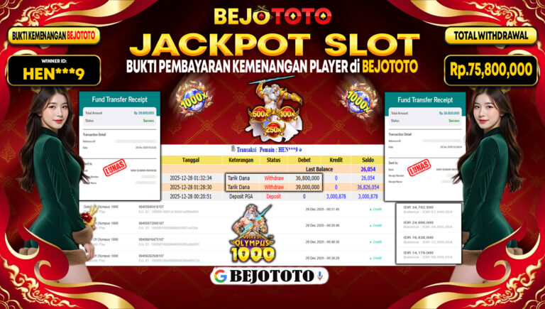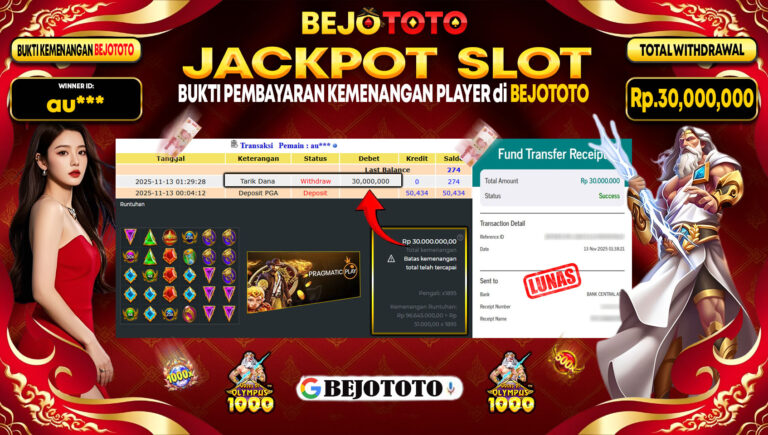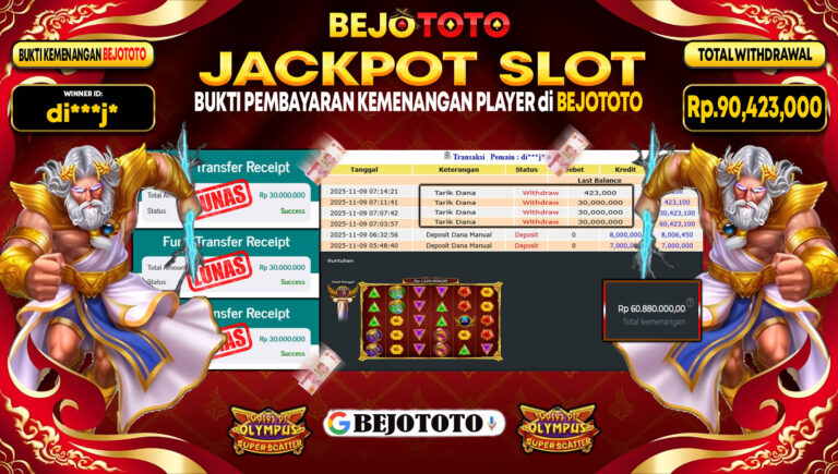BEJOTOTO – Selamat kepada User id : BA****U Telah berhasil mendapatkan kemenangan besar pada permainan SLOT PRAGMATIC GATES OF OLYMPUS Dengan kemenangan Sebesar Rp.75,000,000,-. Setelah mengisi formulir withdraw dengan kurung waktu hanya 5 – 10 menit pihak BEJOTOTO sudah melakukan transfer kepada pemilik Userid dan dana sudah dapat di cairkan oleh pemenang. Bukti pembayaran yang kami berikan merupakan bukti pembayaran yang SAH /…