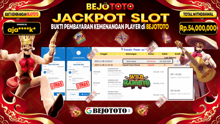 BEJOTOTO – Selamat kepada User id : aja****k* Telah berhasil mendapatkan kemenangan besar pada permainan SLOT WILD BANDITO Dengan kemenangan Sebesar Rp.54,000,000-. Setelah mengisi formulir withdraw dengan kurung waktu hanya 5 – 10 menit pihak BEJOTOTO sudah melakukan transfer kepada pemilik Userid dan dana sudah dapat di cairkan oleh pemenang. Bukti pembayaran yang kami berikan merupakan bukti pembayaran yang SAH…