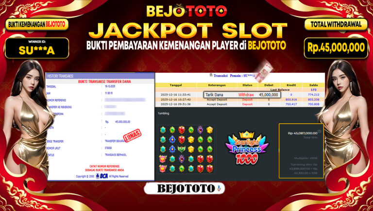 BEJOTOTO – Selamat kepada User id : SU***A Telah berhasil mendapatkan kemenangan besar pada permainan SLOT PRAGMATIC PRAGMATIC STARLIGHT PRINCESS 1000 Dengan kemenangan Sebesar Rp.45,000,000,-. Setelah mengisi formulir withdraw dengan kurung waktu hanya 5 – 10 menit pihak BEJOTOTO sudah melakukan transfer kepada pemilik Userid dan dana sudah dapat di cairkan oleh pemenang. Bukti pembayaran yang kami berikan merupakan bukti pembayaran yang SAH…