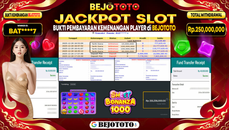 BEJOTOTO – Selamat kepada User id : BAT****7 Telah berhasil mendapatkan kemenangan besar pada permainan SLOT PRAGMATIC PRAGMATIC SWEET BONANZA 1000 Dengan kemenangan Sebesar Rp.250,000,000,-. Setelah mengisi formulir withdraw dengan kurung waktu hanya 5 – 10 menit pihak BEJOTOTO sudah melakukan transfer kepada pemilik Userid dan dana sudah dapat di cairkan oleh pemenang. Bukti pembayaran yang kami berikan merupakan bukti…