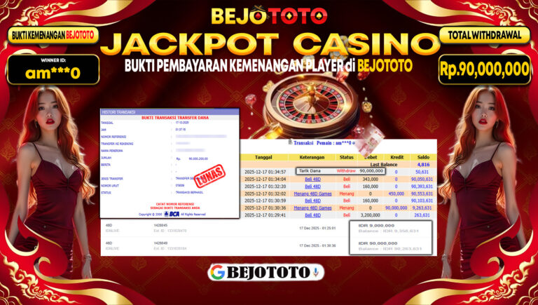 BEJOTOTO – Selamat kepada User id : am***0 Telah berhasil mendapatkan kemenangan besar pada permainan LIVE CASINO 48D GAMES Dengan kemenangan Sebesar Rp.90,000,000,-. Setelah mengisi formulir withdraw dengan kurung waktu hanya 5 – 10 menit pihak BEJOTOTO sudah melakukan transfer kepada pemilik Userid dan dana sudah dapat di cairkan oleh pemenang. Bukti pembayaran yang kami berikan merupakan bukti pembayaran yang SAH /…