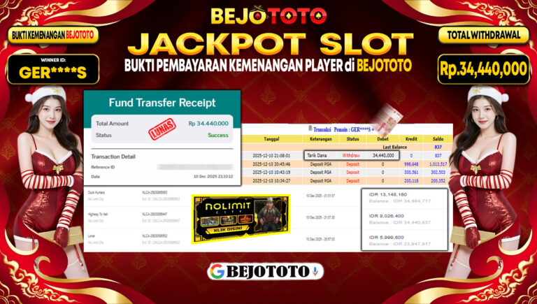BEJOTOTO – Selamat kepada User id : GER****S Telah berhasil mendapatkan kemenangan besar pada permainan SLOT NO LIMIT CITY DUCK HUNTERS Dengan kemenangan Sebesar Rp.34,440,000,-. Setelah mengisi formulir withdraw dengan kurung waktu hanya 5 – 10 menit pihak BEJOTOTO sudah melakukan transfer kepada pemilik Userid dan dana sudah dapat di cairkan oleh pemenang. Bukti pembayaran yang kami berikan merupakan bukti pembayaran…