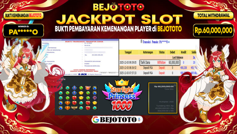 BEJOTOTO – Selamat kepada User id : ons****1 Telah berhasil mendapatkan kemenangan besar pada permainan SLOT PRAGMATIC PRAGMATIC STARLIGHT PRINCESS 1000 Dengan kemenangan Sebesar Rp.60,000,000,-. Setelah mengisi formulir withdraw dengan kurung waktu hanya 5 – 10 menit pihak BEJOTOTO sudah melakukan transfer kepada pemilik Userid dan dana sudah dapat di cairkan oleh pemenang. Bukti pembayaran yang kami berikan merupakan bukti pembayaran yang SAH…