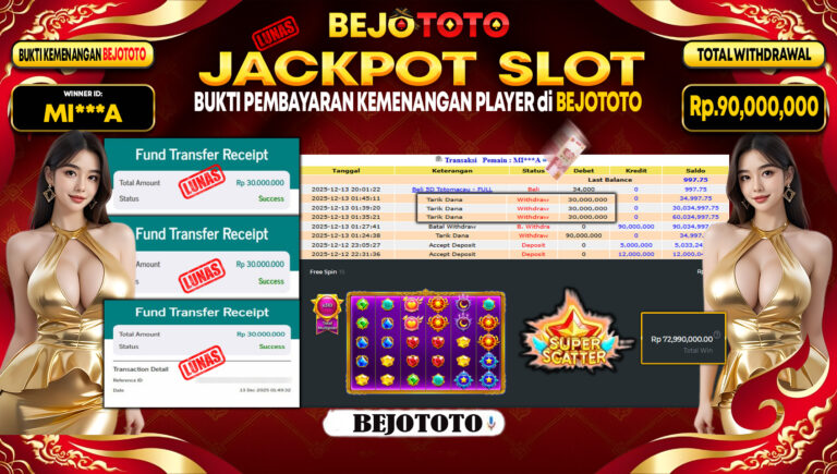 BEJOTOTO – Selamat kepada User id : di***j* Telah berhasil mendapatkan kemenangan besar pada permainan SLOT PRAGMATIC GATES OF OLYMPUS SUPER SCATTER Dengan kemenangan Sebesar Rp.90,423,000,-. Setelah mengisi formulir withdraw dengan kurung waktu hanya 5 – 10 menit pihak BEJOTOTO sudah melakukan transfer kepada pemilik Userid dan dana sudah dapat di cairkan oleh pemenang. Bukti pembayaran yang kami berikan merupakan bukti…