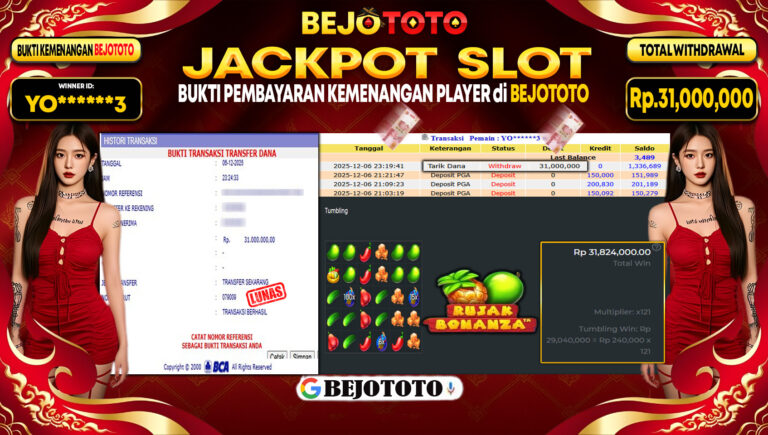 BEJOTOTO – Selamat kepada User id :YO******3 Telah berhasil mendapatkan kemenangan besar pada permainan SLOT PRAGMATIC RUJAK BONANZA Dengan kemenangan Sebesar Rp.31,000,000,-. Setelah mengisi formulir withdraw dengan kurung waktu hanya 5 – 10 menit pihak BEJOTOTO sudah melakukan transfer kepada pemilik Userid dan dana sudah dapat di cairkan oleh pemenang. Bukti pembayaran yang kami berikan merupakan bukti pembayaran yang SAH…