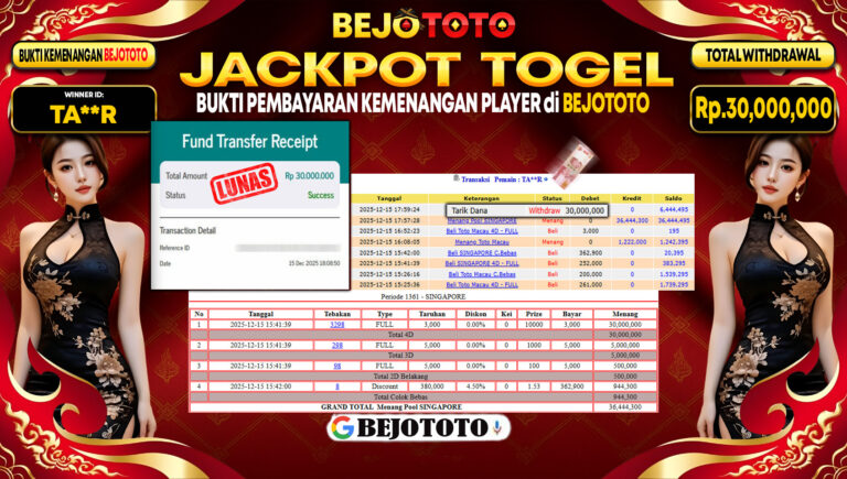 BEJOTOTO – Selamat kepada User id : TA**R Telah berhasil mendapatkan kemenangan besar pada permainan TOGEL SINGAPORE POOLS Dengan kemenangan Sebesar Rp.30,000,000,-. Setelah mengisi formulir withdraw dengan kurung waktu hanya 5 – 10 menit pihak BEJOTOTO sudah melakukan transfer kepada pemilik Userid dan dana sudah dapat di cairkan oleh pemenang. Bukti pembayaran yang kami berikan merupakan bukti pembayaran yang SAH / VALID yang…