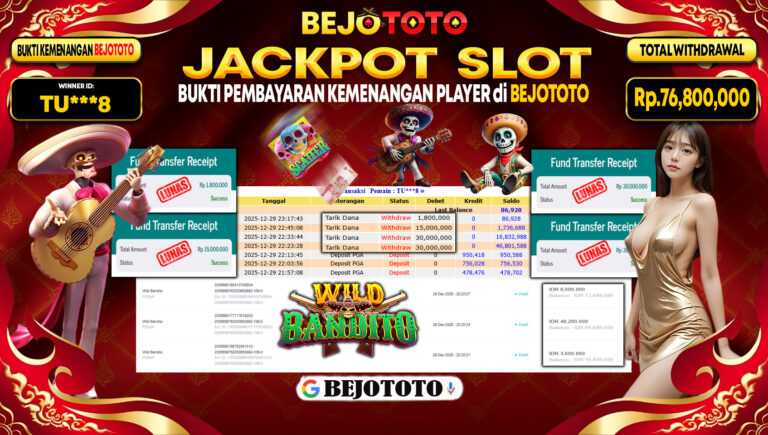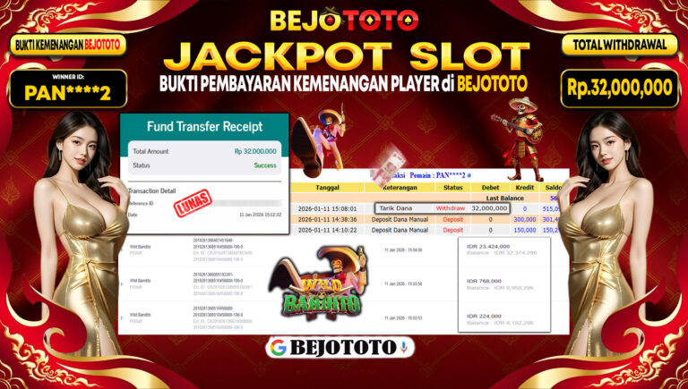 BEJOTOTO – Selamat kepada User id : PAN****2 Telah berhasil mendapatkan kemenangan besar pada permainan SLOT WILD BANDITO Dengan kemenangan Sebesar Rp.30,000,000-. Setelah mengisi formulir withdraw dengan kurung waktu hanya 5 – 10 menit pihak BEJOTOTO sudah melakukan transfer kepada pemilik Userid dan dana sudah dapat di cairkan oleh pemenang. Bukti pembayaran yang kami berikan merupakan bukti pembayaran yang SAH…