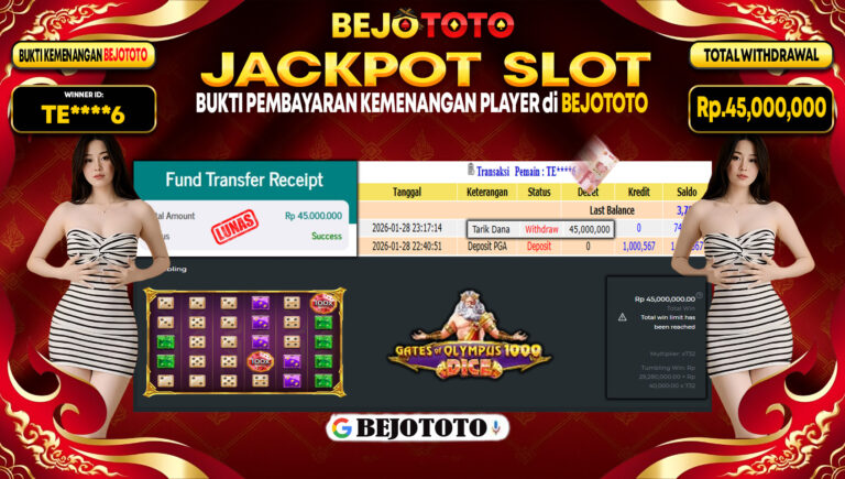 BEJOTOTO – Selamat kepada User id : TE****6 Telah berhasil mendapatkan kemenangan besar pada permainan SLOT PRAGMATIC GATES OF OLYMPUS 1000 DICE Dengan kemenangan Sebesar Rp.45,000,000,-. Setelah mengisi formulir withdraw dengan kurung waktu hanya 5 – 10 menit pihak BEJOTOTO sudah melakukan transfer kepada pemilik Userid dan dana sudah dapat di cairkan oleh pemenang. Bukti pembayaran yang kami berikan merupakan bukti…
