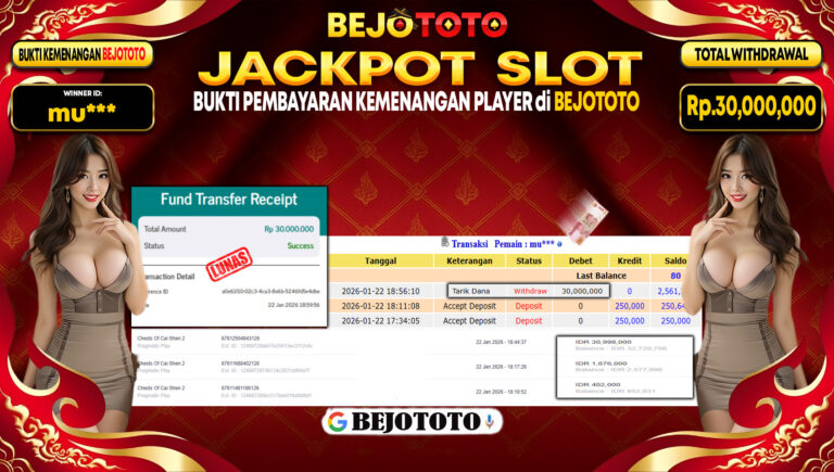 BEJOTOTO – Selamat kepada User id : mu*** Telah berhasil mendapatkan kemenangan besar pada permainan SLOT PRAGMATIC PRAGMATIC CHESTS OF CAI SHEN 2 Dengan kemenangan Sebesar Rp.30,000,000,-. Setelah mengisi formulir withdraw dengan kurung waktu hanya 5 – 10 menit pihak BEJOTOTO sudah melakukan transfer kepada pemilik Userid dan dana sudah dapat di cairkan oleh pemenang. Bukti pembayaran yang kami berikan merupakan…