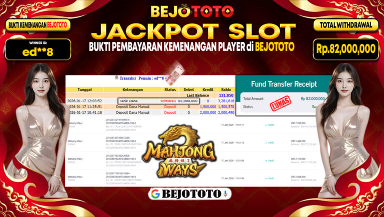 BEJOTOTO – Selamat kepada User id : ed**8 Telah berhasil mendapatkan kemenangan besar pada permainan SLOT MAHJONG WAYS Dengan kemenangan Sebesar Rp.82,000,000-. Setelah mengisi formulir withdraw dengan kurung waktu hanya 5 – 10 menit pihak BEJOTOTO sudah melakukan transfer kepada pemilik Userid dan dana sudah dapat di cairkan oleh pemenang. Bukti pembayaran yang kami berikan merupakan bukti pembayaran yang SAH…