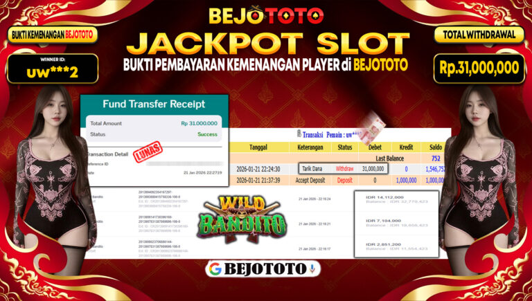 BEJOTOTO – Selamat kepada User id : uw***2 Telah berhasil mendapatkan kemenangan besar pada permainan SLOT WILD BANDITO Dengan kemenangan Sebesar Rp.31,000,000-. Setelah mengisi formulir withdraw dengan kurung waktu hanya 5 – 10 menit pihak BEJOTOTO sudah melakukan transfer kepada pemilik Userid dan dana sudah dapat di cairkan oleh pemenang. Bukti pembayaran yang kami berikan merupakan bukti pembayaran yang SAH…