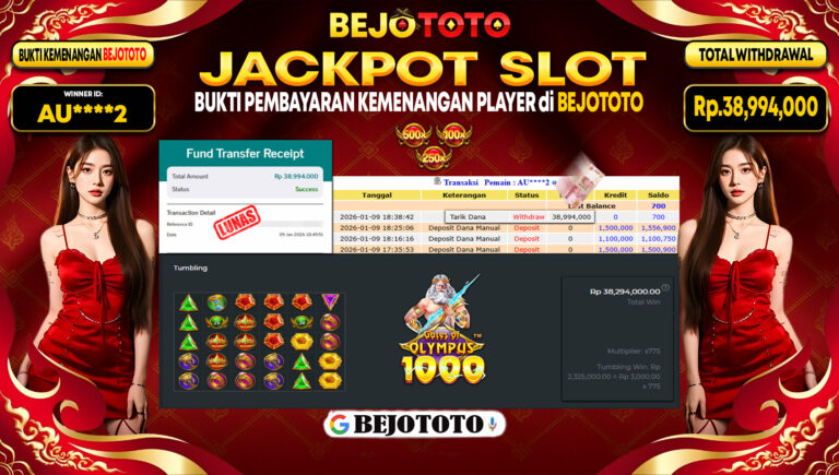 BEJOTOTO – Selamat kepada User id : AU****2 Telah berhasil mendapatkan kemenangan besar pada permainan SLOT PRAGMATIC GATES OF OLYMPUS 1000 Dengan kemenangan Sebesar Rp.38,994,000,-. Setelah mengisi formulir withdraw dengan kurung waktu hanya 5 – 10 menit pihak BEJOTOTO sudah melakukan transfer kepada pemilik Userid dan dana sudah dapat di cairkan oleh pemenang. Bukti pembayaran yang kami berikan merupakan bukti…