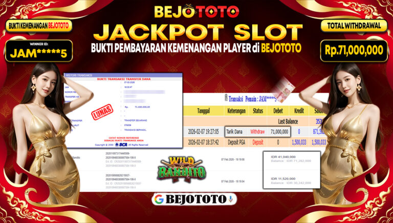 BEJOTOTO – Selamat kepada User id : JAM*****5 Telah berhasil mendapatkan kemenangan besar pada permainan SLOT WILD BANDITO Dengan kemenangan Sebesar Rp.71,000,000-. Setelah mengisi formulir withdraw dengan kurung waktu hanya 5 – 10 menit pihak BEJOTOTO sudah melakukan transfer kepada pemilik Userid dan dana sudah dapat di cairkan oleh pemenang. Bukti pembayaran yang kami berikan merupakan bukti pembayaran yang SAH…