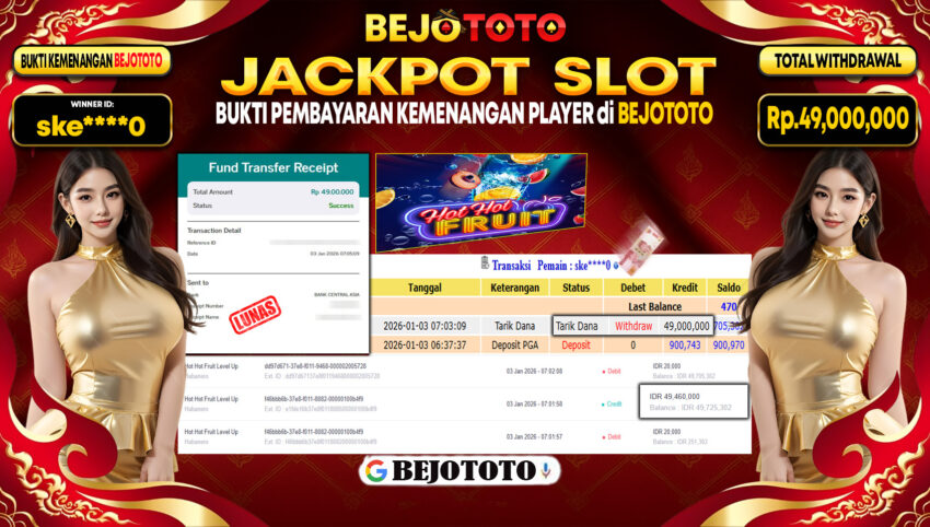 BEJOTOTO – Selamat kepada User id : ske****0 Telah berhasil mendapatkan kemenangan besar pada permainan  SLOT HABANERO HOT HOT FRUIT LEVEL UP Dengan kemenangan Sebesar Rp.49,000,000,-. Setelah mengisi formulir withdraw dengan kurung waktu hanya 5 – 10 menit pihak BEJOTOTO sudah melakukan transfer kepada pemilik Userid dan dana sudah dapat di cairkan oleh pemenang. Bukti pembayaran yang kami berikan merupakan bukti pembayaran yang SAH / VALID yang langung di dapatkan melaui tanda transfer transaksi dari Bank yang di tuju.
