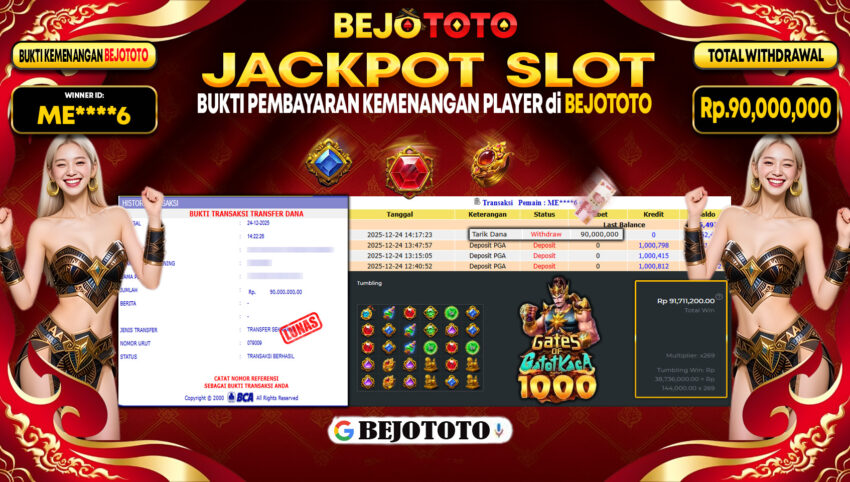 BEJOTOTO – Selamat kepada User id : ME****6 Telah berhasil mendapatkan kemenangan besar pada permainan SLOT PRAGMATIC PRAGMATIC GATES OF GATOT KACA 1000 Dengan kemenangan Sebesar Rp.90,000,000,-. Setelah mengisi formulir withdraw dengan kurung waktu hanya 5 – 10 menit pihak BEJOTOTO sudah melakukan transfer kepada pemilik Userid dan dana sudah dapat di cairkan oleh pemenang. Bukti pembayaran yang kami berikan merupakan bukti pembayaran yang SAH / VALID yang langung di dapatkan melaui tanda transfer transaksi dari Bank yang di tuju.