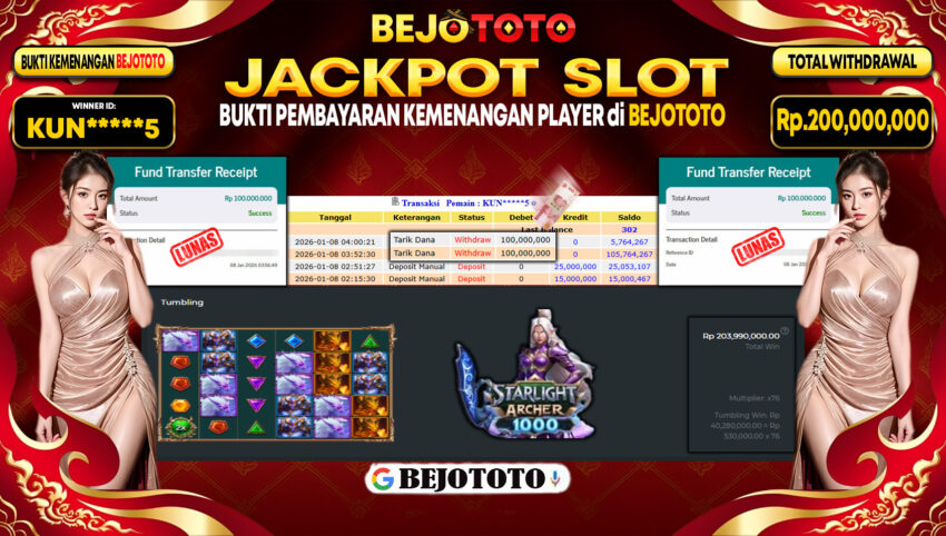 BEJOTOTO – Selamat kepada User id : KUN*****5 Telah berhasil mendapatkan kemenangan besar pada permainan  SLOT PRAGMATIC PRAGMATIC STARLIGHT ARCHER 1000 Dengan kemenangan Sebesar Rp.200,000,000,-. Setelah mengisi formulir withdraw dengan kurung waktu hanya 5 – 10 menit pihak BEJOTOTO sudah melakukan transfer kepada pemilik Userid dan dana sudah dapat di cairkan oleh pemenang. Bukti pembayaran yang kami berikan merupakan bukti pembayaran yang SAH / VALID yang langung di dapatkan melaui tanda transfer transaksi dari Bank yang di tuju.