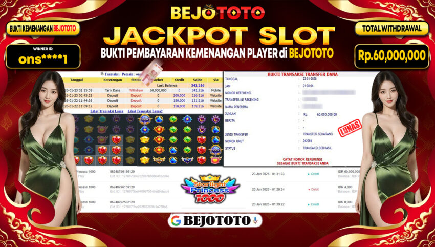 BEJOTOTO – Selamat kepada User id : ons****1 Telah berhasil mendapatkan kemenangan besar pada permainan  SLOT PRAGMATIC PRAGMATIC STARLIGHT PRINCESS 1000 Dengan kemenangan Sebesar Rp.60,000,000,-. Setelah mengisi formulir withdraw dengan kurung waktu hanya 5 – 10 menit pihak BEJOTOTO sudah melakukan transfer kepada pemilik Userid dan dana sudah dapat di cairkan oleh pemenang. Bukti pembayaran yang kami berikan merupakan bukti pembayaran yang SAH / VALID yang langung di dapatkan melaui tanda transfer transaksi dari Bank yang di tuju.