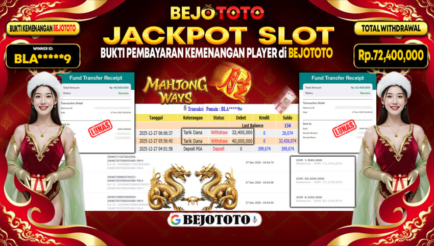 BEJOTOTO – Selamat kepada User id : BLA*****9 Telah berhasil mendapatkan kemenangan besar pada permainan SLOT MAHJONG WAYS Dengan kemenangan Sebesar Rp.72,400,000-. Setelah mengisi formulir withdraw dengan kurung waktu hanya 5 – 10 menit pihak BEJOTOTO sudah melakukan transfer kepada pemilik Userid dan dana sudah dapat di cairkan oleh pemenang. Bukti pembayaran yang kami berikan merupakan bukti pembayaran yang SAH / VALID yang langung di dapatkan melaui tanda transfer transaksi dari Bank yang di tuju.