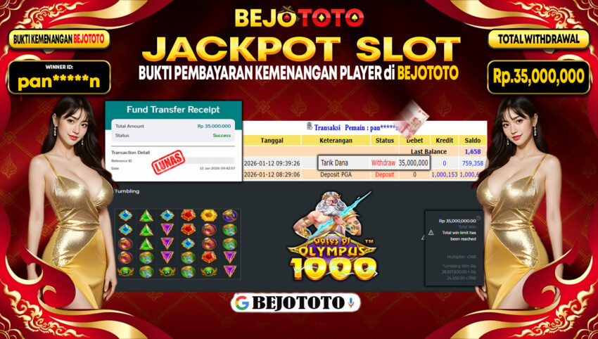 BEJOTOTO – Selamat kepada User id : pan*****n Telah berhasil mendapatkan kemenangan besar pada permainan  SLOT PRAGMATIC GATES OF OLYMPUS 1000  Dengan kemenangan Sebesar Rp.35,000,000,-. Setelah mengisi formulir withdraw dengan kurung waktu hanya 5 – 10 menit pihak BEJOTOTO sudah melakukan transfer kepada pemilik Userid dan dana sudah dapat di cairkan oleh pemenang. Bukti pembayaran yang kami berikan merupakan bukti pembayaran yang SAH / VALID yang langung di dapatkan melaui tanda transfer transaksi dari Bank yang di tuju.