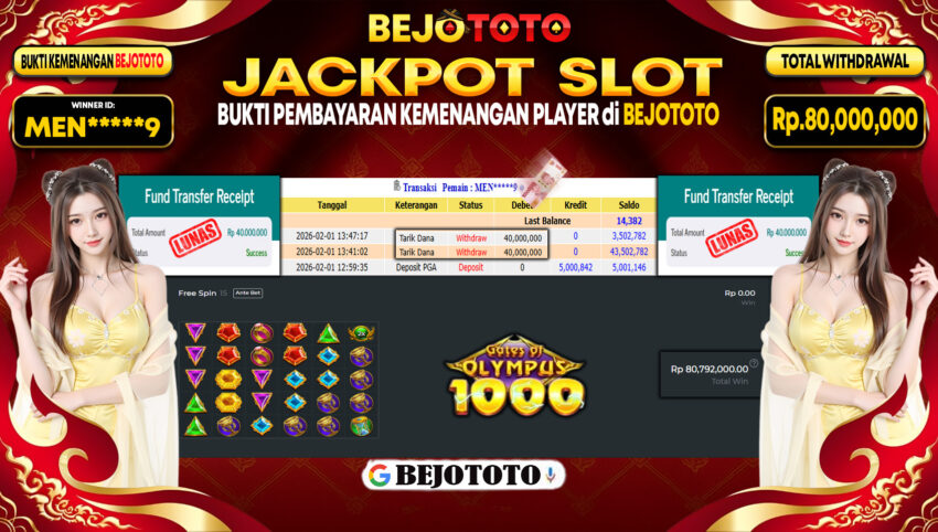BEJOTOTO – Selamat kepada User id : MEN*****9 Telah berhasil mendapatkan kemenangan besar pada permainan  SLOT PRAGMATIC GATES OF OLYMPUS 1000  Dengan kemenangan Sebesar Rp.80,000,000,-. Setelah mengisi formulir withdraw dengan kurung waktu hanya 5 – 10 menit pihak BEJOTOTO sudah melakukan transfer kepada pemilik Userid dan dana sudah dapat di cairkan oleh pemenang. Bukti pembayaran yang kami berikan merupakan bukti pembayaran yang SAH / VALID yang langung di dapatkan melaui tanda transfer transaksi dari Bank yang di tuju.