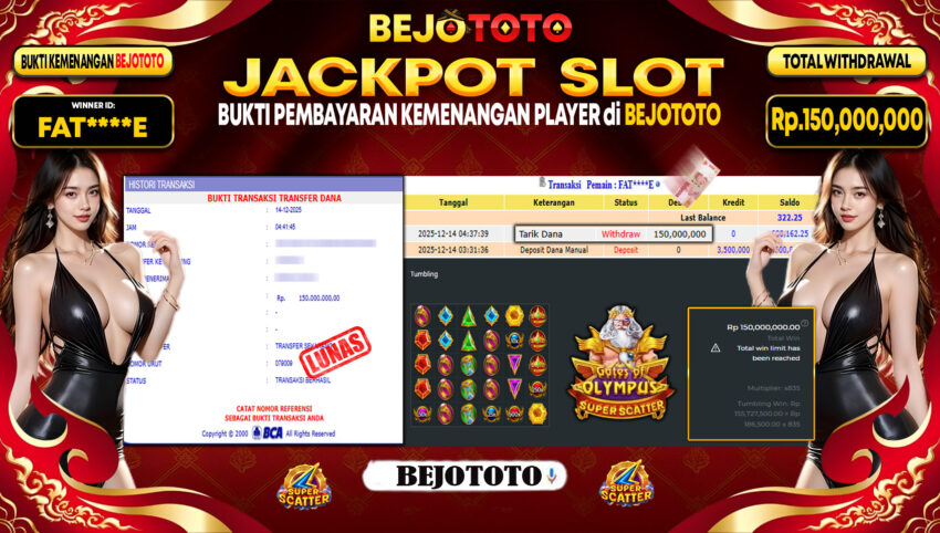 BEJOTOTO – Selamat kepada User id : FAT****E Telah berhasil mendapatkan kemenangan besar pada permainan SLOT PRAGMATIC GATES OF OLYMPUS SUPER SCATTER Dengan kemenangan Sebesar Rp.150,000,000,-. Setelah mengisi formulir withdraw dengan kurung waktu hanya 5 – 10 menit pihak BEJOTOTO sudah melakukan transfer kepada pemilik Userid dan dana sudah dapat di cairkan oleh pemenang. Bukti pembayaran yang kami berikan merupakan bukti pembayaran yang SAH / VALID yang langung di dapatkan melaui tanda transfer transaksi dari Bank yang di tuju.