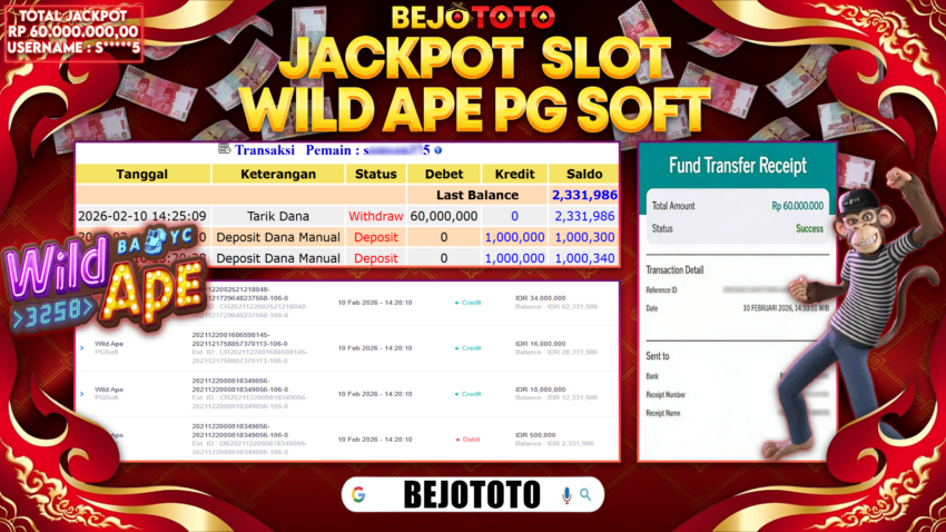 BEJOTOTO JACKPOT SLOT WILD APE Rp.60,000,000- LUNAS!!